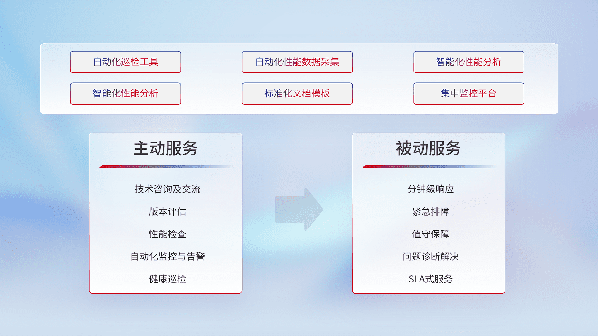 智能化工具和标准化文档,,保障服务质量,,提供主动服务(包含技术咨询、、、、版本评估、、、、性能检查、、、、自动化监控与告警、、健康巡检)和被动服务包含(分钟级响应、、、、紧急排障、、、、值守保障、、、问题诊断解决、、、、SLA服务)。。。