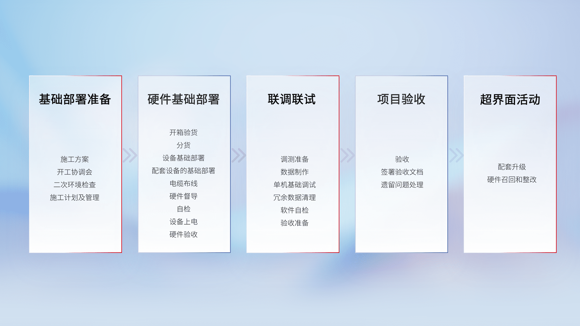 从基础部署准备、、、、硬件基础部署、、、联调联试、、、项目验收、、、、越界面活动的全过程可追溯,,,保证施工质量和进度。。。